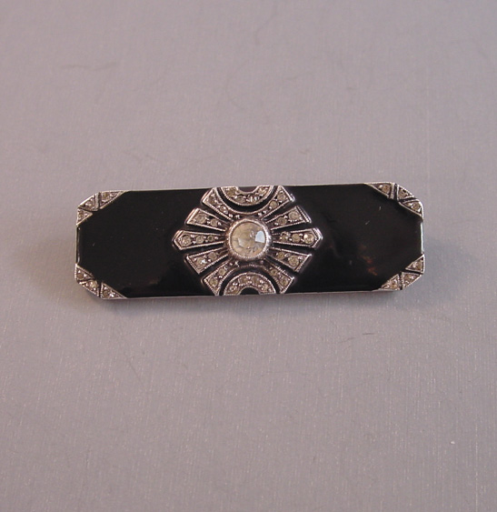 FRENCH Deco silver paste enamel black brooch, boxed and hallmarked, 1-3/4″. The hallmark is tiny, but I think it is the French eagle mark and the letter “B”. It has the European style trombone catch on the back. View View View #Q38364 $238.00