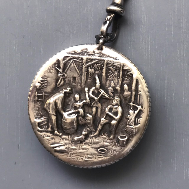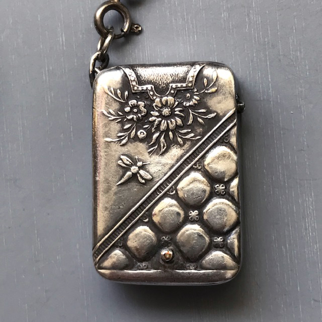 ENGLISH sterling three-footed jewelry box hallmarked for Birmingham 1919, but the maker’s mark is illegible. It has a Deco style engine turned top and is lined in the original dusty rose colored velvet, which is in very good condition. The box is 3-1/2″ by 2″ tall including the feet and 1-3/4″ without them. It has … Continue reading “ENGLISH sterling three-footed jewelry box hallmarked, 1919”