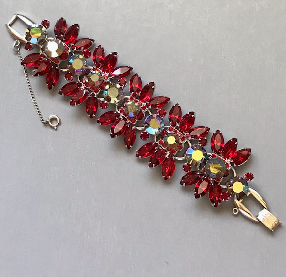 JULIANA DeLizza & Elster wide bracelet with brilliant red marquis shaped rhinestones and red and aurora borealis rhinestone accents set in silver tone metal and with it’s original safety chain. Made in the 1960s, it is 7″ long and 1-1/2″ wide. Spectacular is the word for this wonderful bracelet! The colors and the wide width … Continue reading “JULIANA DeLizza & Elster wide bracelet with brilliant red marquis shaped rhinestones and red and aurora borealis rhinestone accents”