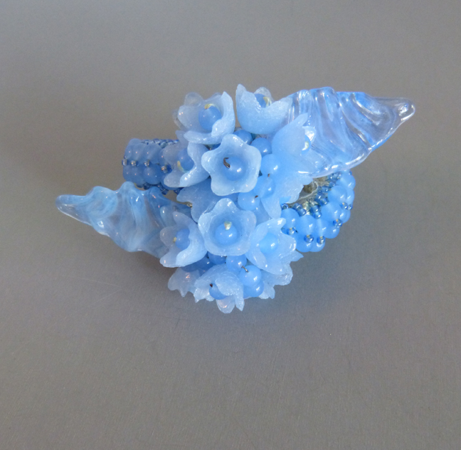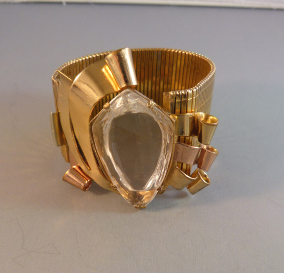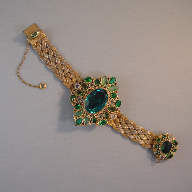 HOBE pastel blue rhinestone bracelet, 6-3/4″ by 3/4″, and it still has it’s safety chain. It has eight square links, each in a flower shape, and each with sparkling unfoiled blue rhinestones set into gold tone hand-wrought wire work, circa 1940s. It has a box clasp, which is working well, as well as a flip-over … Continue reading “HOBE pastel blue rhinestone bracelet, set in hand wrought wire work”