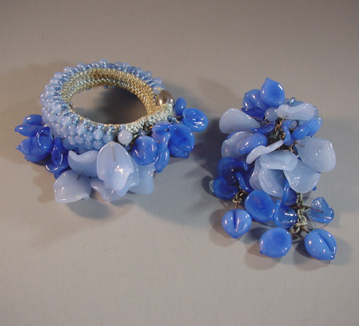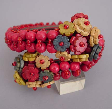 HASKELL early Hess wooden beads and glass seed beads coil bracelet, 6″, showing the woven coil cover construction of the bracelet. The beads dangle on strings allowing them to move a bit. See a bracelet in this series in Carole Tanenbaum’s “Fabulous Fakes” book on page 100. This kind of hand work was extremely labor … Continue reading “MIRIAM HASKELL early Hess wooden beads and glass seed beads coil bracelet”