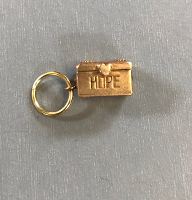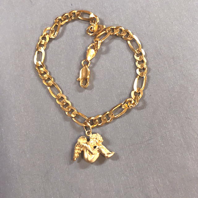 VICTORIAN bracelet made from a watch or vest chain in gold tone metal with textured circle shaped links with raised dots on them, 7″ and 5/16″ wide. Wear it as it is or add charms to it, lovely either way! FOR MOLLY ONLY! View View #V40896 $85.00