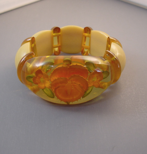 BAKELITE chunks charm bracelet in shades of marbled butterscotch, pumpkin orange and caramel all on a gold tone chain. It’s 7″ long and each disk is 1-1/2″ long. #B40602 $38.00