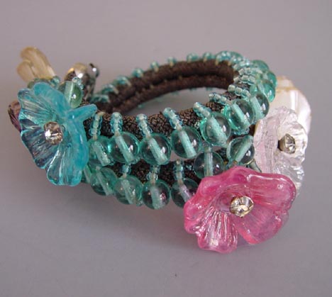 HOBE bracelet with opalescent diamond-shaped cabochons in pastel blue and green, each wrapped in clear rhinestone baguettes and accented by two rows of little opalescent white cabochons. This is 6-5/8″ by 1″, and is set in gold tone which shows light wear only on the back. It has it’s original safety chain and is marked … Continue reading “HOBE bracelet with opalescent diamond-shaped cabochons”