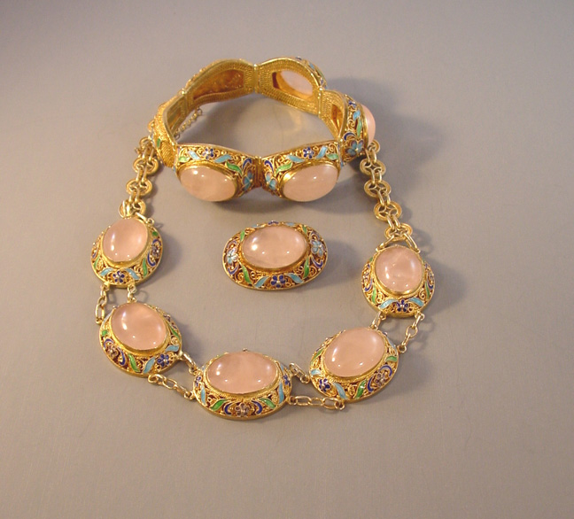 BLUE rhinestones and aurora borealis set of a necklace, bracelet, brooch and earrings all set in silver tone. The necklace is 14-1/2″ by 3/4″, the bracelet 7-1/4″ by 3/4″, circle pin 2-1/4″, clip back earrings 1-1/3″. The bracelet has it’s safety chain for added security. A lovely set in excellent condition circa 1950s. View View … Continue reading “BLUE aurora borealis set necklace, bracelet, brooch, earrings”