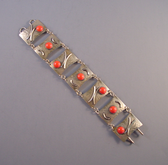 FRED HARVEY sterling dragon’s breath cabochon bracelet with thunderbirds on each side and symbols all the way around to the back. It is a bit smaller size at 6″ total including the 1-1/4″ back opening. Marked “sterling” on the back, it is a fine example of this 1950s style. View #N40226 $228.00