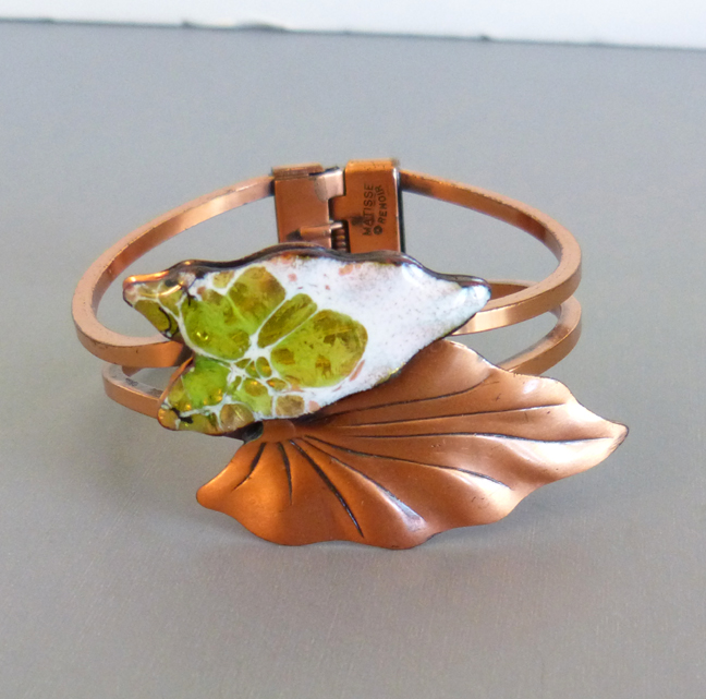 LISNER bracelet with emerald green colored marquis-shaped rhinestones set in lovely brushed gold tone leaves. Marked “Lisner” on the back of the catch, the bracelet is 7″ long and about 3/4″ wide. In excellent vintage condition, this is circa 1960. View #Y40140 $36.00