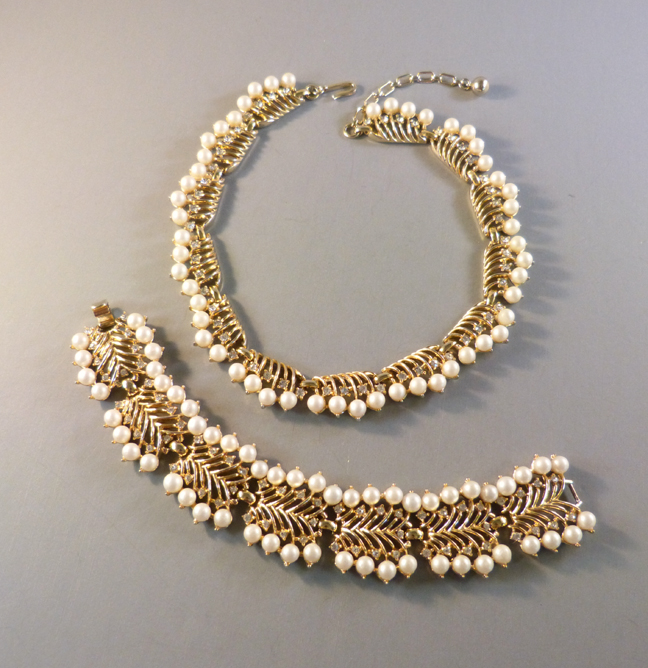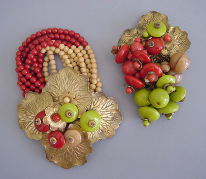 HAR figural genie bracelet with two glass “crystals”, one a crystal ball and one a lamp base, red cabochons, aurora borealis and clear rhinestones all set in textured gold tone with brown enameled accents. Inside the genie’s ball is a peacock blue rhinestone star. This spectacular bracelet is 7-1/4″ by 1-5/8″. Circa 1960, it’s in … Continue reading “HAR figural genie bracelet with wonderful different links”