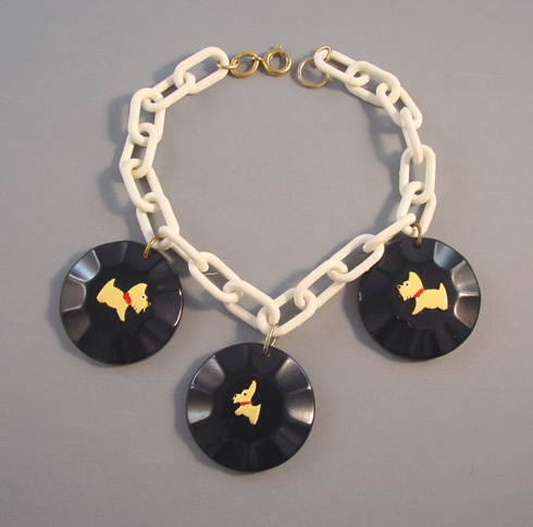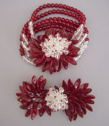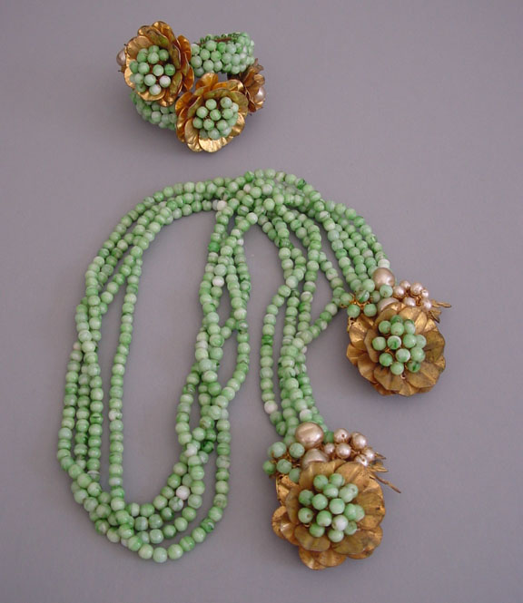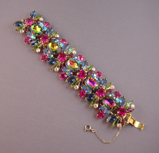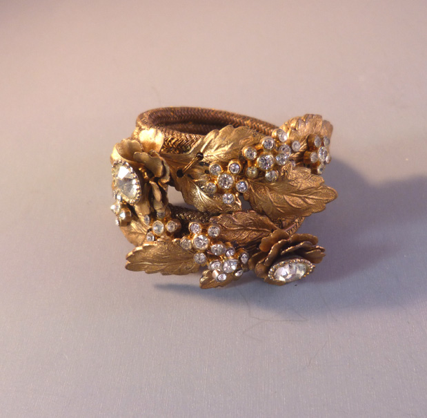 Search Results for: braceletSTERLING and marcasite entwined links braceletSTERLING and marcasite entwined links bracelet, 7″ by 1-1/2″. Marked on the back of the fold over catch “925 FAS”, it is in excellent vintage condition. View #N39672 $98.00 MIRIAM HASKELL Hess coil bracelet of pink, blue and clear glassMIRIAM HASKELL Hess coil bracelet of pink, blue and clear glass beads and flowers, circa 1940. The bracelet is made up of pate de verre glass, glass beads, flowers and seed beads, just lush and gorgeous and all done by hand. The base is a woven cloth-covered heavy wire coil so it wraps around the wrist and … Continue reading “MIRIAM HASKELL Hess coil bracelet of pink, blue and clear glass” SHULTZ bakelite two-row lavender and apple juice MAIDEN’S size braceletSHULTZ bakelite two-row lavender and apple juice checked bangle, the slightly smaller maiden size at 2-1/4″ by 1-1/8″ by 1/3″. Lavender is an unusual color to find in vintage bakelite. Ron Schultz, who began making his bakelite jewelry in the 1980s, creates his pieces using 1940s vintage bakelite material, and this was made especially for … Continue reading “SHULTZ bakelite two-row lavender and apple juice MAIDEN’S size bracelet” JOSEPH GOURDJI wide cuff bracelet with enameled faceJOSEPH GOURDJI wide cuff bracelet with enameled face and clear rhinestone tiara, circa 1990s. This is an average of 8″ wearable size and 4-1/3″ wide. Gourdji was a New York jewelry maker who didn’t make a lot of jewelry, but he sure made some wonderful pieces, many with a face motif like this showy piece. Earlier in his … Continue reading “JOSEPH GOURDJI wide cuff bracelet with enameled face” PLASTIC root beer elastic strung belt buckle braceletPLASTIC root beer colored elastic strung belt buckle bracelet, 6-3/4″ by 7/8″. It is 8-1/2″ total length by 7/8″ wide at the sides and back. You can see a similar bracelet in bakelite on page 57 of Davidov & Dawes “The Bakelite Jewelry Book”. This is a bit smaller wrist size than standard, and it is … Continue reading “PLASTIC root beer elastic strung belt buckle bracelet” NE FROM Denmark Scandinavian sterling bracelet with a tiger eyeNE FROM Denmark Scandinavian sterling bracelet with a tiger eye center, 7″ wearable size with a 1″ back opening, and the tiger eye itself is 1″ by 1/2″. The width graduates from 1″ wide at the front to 1/2″ at the back. Marked inside “NE From Denmark sterling 925S” on one end. The letters “NE” … Continue reading “NE FROM Denmark Scandinavian sterling bracelet with a tiger eye” FARFAN “Hencho Mexico” silver bracelet abalone masksFARFAN “Hencho Mexico” silver bracelet with abalone masks and inlaid abalone rectangles, 7-1/4″ by 1-1/4″, weight 2.48 ounces. This is in very good vintage condition with an easily working clasp, but one segment has a slightly dented edging around the abalone rectangle. View View View View View View View #N66500 $98.00 DEL RIO Mexican sterling bracelet with green stonesDEL RIO Mexican sterling bracelet with 6 links, each with an oval green cabochon in the center, surrounded by scrolls and beaded edging, 7″ by 1/2″. It is marked on the clasp “Del Rio 0.925 sterling Hencho in Mexico”. It is in very good vintage condition with a working clasp and it weighs .74 ozs. … Continue reading “DEL RIO Mexican sterling bracelet with green stones” MEXICO abalone inlaid sterling hinged links braceletMEXICO abalone inlaid sterling silver hinged links bracelet with geometric designs all the way around and a secure clasp. It is marked on the inside with the maker’s initials “BPM” and “Mexico 925” for sterling. This is in very good vintage condition with a secure box clasp. View View View View View View #N66523 $48.00 HASKELL very rare beaded flowers bracelet and earringsMIRIAM HASKELL very rare beaded flowers bracelet and earrings with glass beaded flowers and leaves, unsigned hinged bangle 7″ by about 1-1/2″, clip back earrings with Miriam Haskell horseshoe mark, 2″. This is in excellent condition and it’s a real treasure. View View View View #H36641 $798.00 |