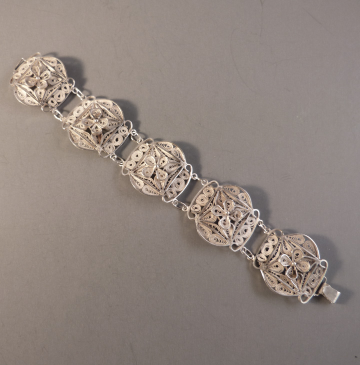 STERLING and marcasite entwined links bracelet, 7″ by 1-1/2″. Marked on the back of the fold over catch “925 FAS”, it is in excellent vintage condition. View #N39672 $98.00