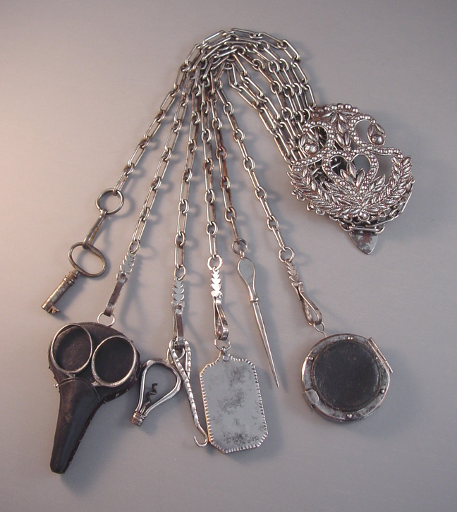 VICTORIAN antique 1850 cut steel sewing chatelaine with 7 implements, 16-1/2″ total length. The implements include a key, scissors with case, tiny corkscrew, aide memoire, sewing awl and round pin holder. This is in as nearly perfect condition as I have ever seen for it’s kind and age, Victorian circa 1850. For years, ladies wore … Continue reading “VICTORIAN antique 1850 cut steel sewing chatelaine with 7 implements”