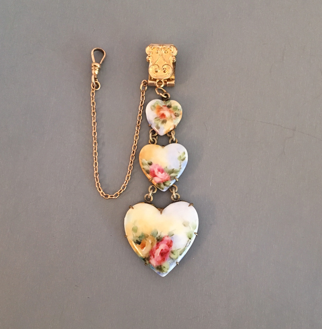 HEARTS charming hand painted porcelain hearts watch fob, 3″ long and 1-1/8″ at the widest. The top part would hook to your clothing and the hook at the end of the chain would hold a small watch or locket. In excellent condition, fobs like this were used often from the turn of the last century to … Continue reading “HEARTS charming hand painted porcelain hearts watch fob”