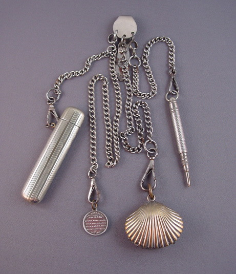 CHATELAINE in silver tone with 4 chains each holding an implement: a shell pin holder; needle case; pencil; and a Queen Victorian memorial coin dated 1901, chains from 3-3/4″ to 10″, needle case 3″; shell 1-1/2″ by 1-1/4″; pencil 2-1/2″ and coin in memory of Queen Victoria, 5/8″. Chatelaines might be comprised of items all used for one … Continue reading “CHATELAINE in silver tone with 4 chains”
