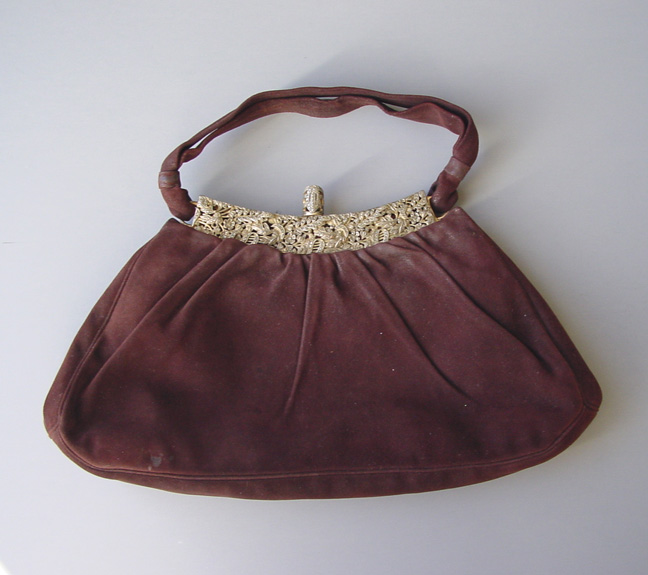 BROWN suede purse with wonderful silver marcasite frame, circa 1940. The reflective quality of marcasites sparkles nicely, and set against the matte finish of the suede, it is a marvelous contrast. The frame has designs of ferns, crescent moons, and other things on it. The body is 12″ by 5-1/3″ and the frame is 5-3/4″ … Continue reading “BROWN suede purse with wonderful silver marcasite frame with crescents and ferns design”