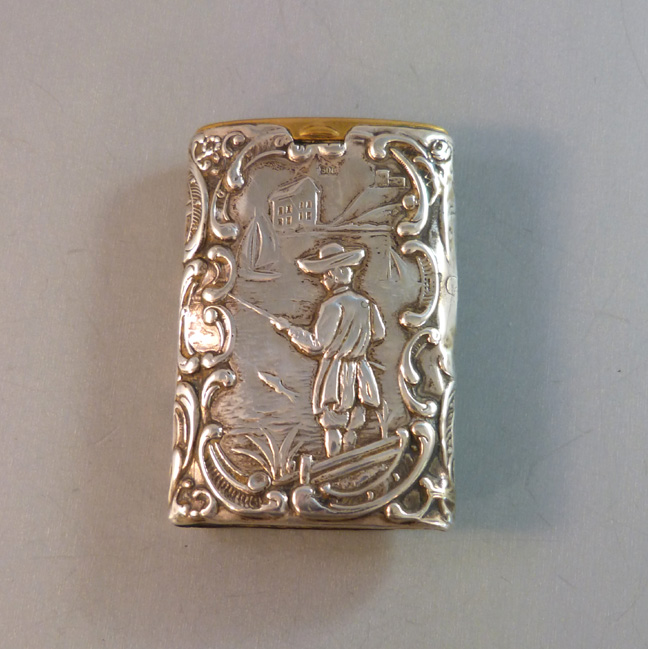 VICTORIAN 900 silver match safe with a farm scene on one side and a fisherman scene on the other, separated by scrolls on both edges, all embossed with great detail. The 900 mark is the US equivalent to coin silver, but other countries used it as well. It has a slide-out tray for the matches rather … Continue reading “VICTORIAN 900 silver match safe with a farm scene”