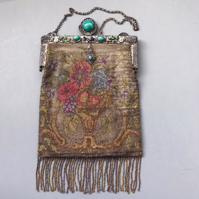 BASKET or urn of flowers, fruit and grapes design steel beaded purse with jeweled and enameled frame set with aqua cabochons and blue rhinestones and green and white enamel work. The beads are reflective and very lovely. The purse body is 9″ long including the fringe and it is 5-1/2″ wide . Lining is intact … Continue reading “BASKET design steel beaded purse with jeweled and enameled frame set with aqua cabochons and blue rhinestones”