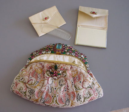 HOBE framed Josef purse with accessories and a glorious frame with a central faceted aqua rhinestone surrounded by moonstone cabochons and brilliant rhinestones in pink, green and clear. They are set in a gold wire work with little flowers. The body is hand beaded with white glass beads and embroidered in pinks, rose, aqua, green … Continue reading “HOBE framed Josef purse with accessories and a glorious frame with a central faceted aqua rhinestone surrounded by moonstone cabochons and brilliant rhinestones”