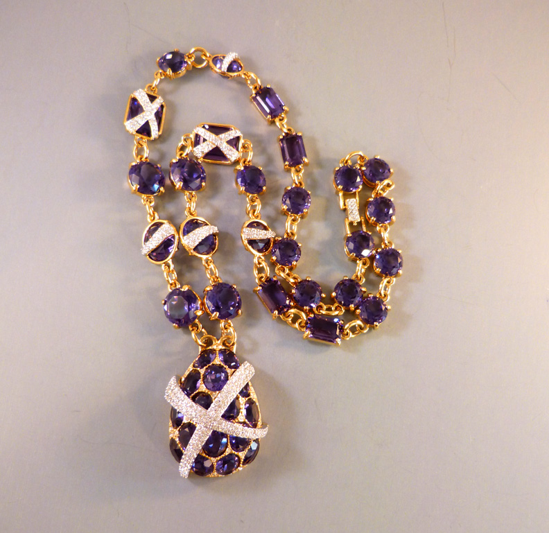 SWAROVSKI Jeweler’s Collection purple rhinestones pendant necklace with clear rhinestones accents and in it’s original Swarovski box with the velvet pouch, early 1990s. This amazing necklace is 30″ long with a 2-1/3″ by 1-1/2″ pendant. On the back are the marks “Swarovski” on the clasp and the swan logo on the back of the pendant. … Continue reading “SWAROVSKI Jeweler’s Collection purple crystals necklace with original box and pouch”