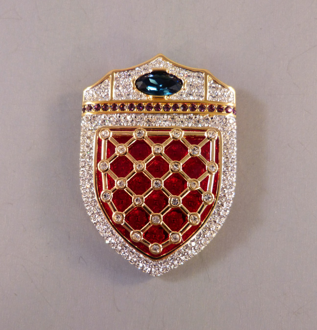 SWAROVSKI Limited Edition 300 Jeweler’s Collection shield brooch in red enamel with a center blue rhinestone and clear rhinestone pave, all set in a hand polished gold plated setting, 2-5/8″ by 2″. This is a limited edition piece and stamped on the back “Limited Edition 300” and the swan logo. It is in excellent condition, … Continue reading “SWAROVSKI Limited Edition 300 Jeweler’s Collection regal brooch with original box”