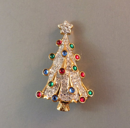 SWAROVSKI 1996 Signature Collection Christmas tree brooch with clear rhinestone boughs, red, blue and green cabochon rhinestone ornaments, all in a hand polished gold plated setting, 1-7/8″. It is marked on the back with the Swarovski swan logo and copyright mark and it is in excellent never worn condition. This can be seen in the … Continue reading “SWAROVSKI 1996 Signature Collection Christmas tree brooch with clear rhinestone boughs, red, blue and green cabochon”
