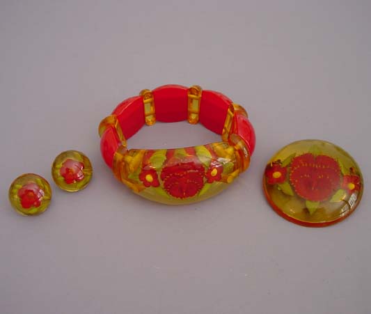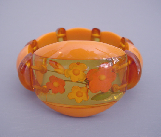 BAKELITE apple juice and butter yellow colored stretchy bracelet with reverse carved pansy, flowers and leaves, a rare color, 7″ by 1-1/8″ front and 1″ back. See other bracelets like this in the fabulous book by Matthew Burkholz “Bakelite Collection” on page 127. Circa 1940, this is in excellent vintage condition. View #B36706 $895.00