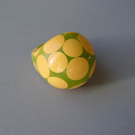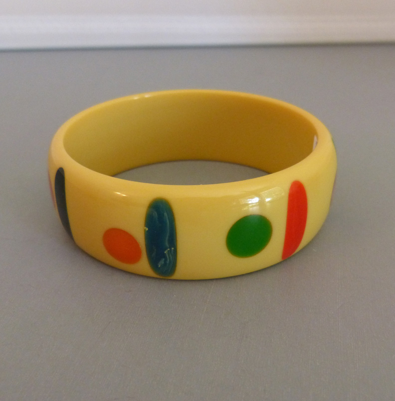 SHULTZ bakelite three-row bangle with aqua, green, pink, lavender orange and white squares and dots, This great bangle has been in my personal collection since 2009 and, over time, it has turned from white to a rich cream, as you can see in the progression of photos. Genuine vintage bakelite will always do this, turning from white to cream and then … Continue reading “SHULTZ bakelite 3-row bangle aqua, green, pink, lavender”