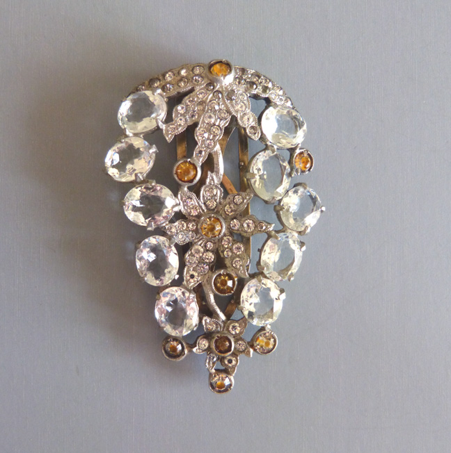 EISENBERG Original clear rhinestone dress clip with topaz colored rhinestone accents and all set in silver tone, circa 1940, 3-1/4″ by 2″. It is from this clip design that Eisenberg drew when making the 1990s “Classics” collection, shown here EISENBERG ICE for reference. (NOTE: This price is for the 1940s clear rhinestone clip only, not the … Continue reading “EISENBERG Original clear rhinestone dress clip with topaz”