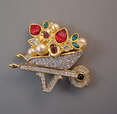 SWAROVSKI 1999 Garden Collection wheelbarrow brooch with a wheel that can actually spin, 2-1/4″ by 2″. The stones include red ribbed glass “flowers”, teal marquis, purple rhinestones and artificial pearls all set in clear rhinestone pave in hand polished gold plate. This is one of the circa 1999 Swarovski Crystal Garden group and has the swan logo mark … Continue reading “SWAROVSKI garden wheelbarrow brooch, spinning wheel 1999”