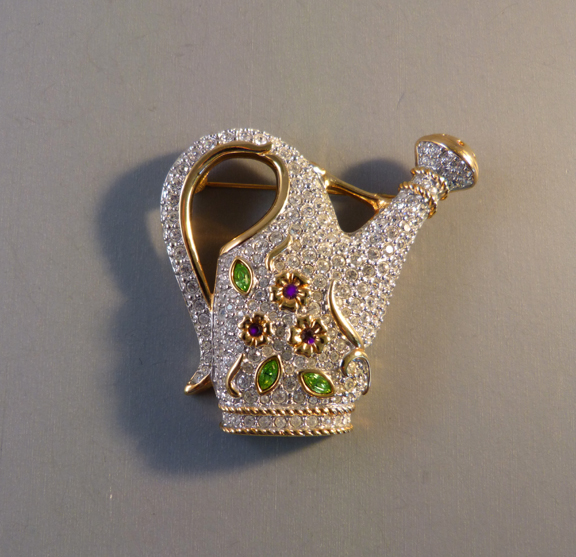 SWAROVSKI 1999 Crystal Garden Collection watering can brooch, clear rhinestone pave with purple and green rhinestone accents set in gold tone watering can brooch 2″ by 2″. It was originally made in 1999 for the Swarovski SCS (Swarovski Collector’s Society) Trunk Show and was one of the twelve brooches in the Crystal Garden Grouping. This is … Continue reading “SWAROVSKI 1999 watering can brooch with clear rhinestone pave”