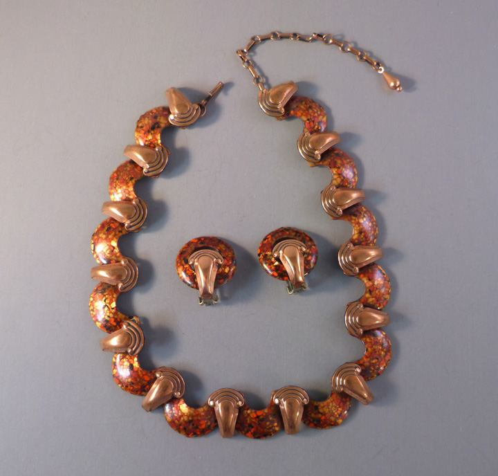 MATISSE enamel on copper necklace and clip back earrings, each marked “Matisse”. The necklace is 17″ by 3/4″ and the earrings 1-1/8″ by 1″. All pieces are in excellent condition with only some color change on the back side . This style can be seen in Matthew Burkholz’ book, “Copper Jewelry” page 132. View View … Continue reading “MATISSE enamel on copper necklace and clip back earrings”