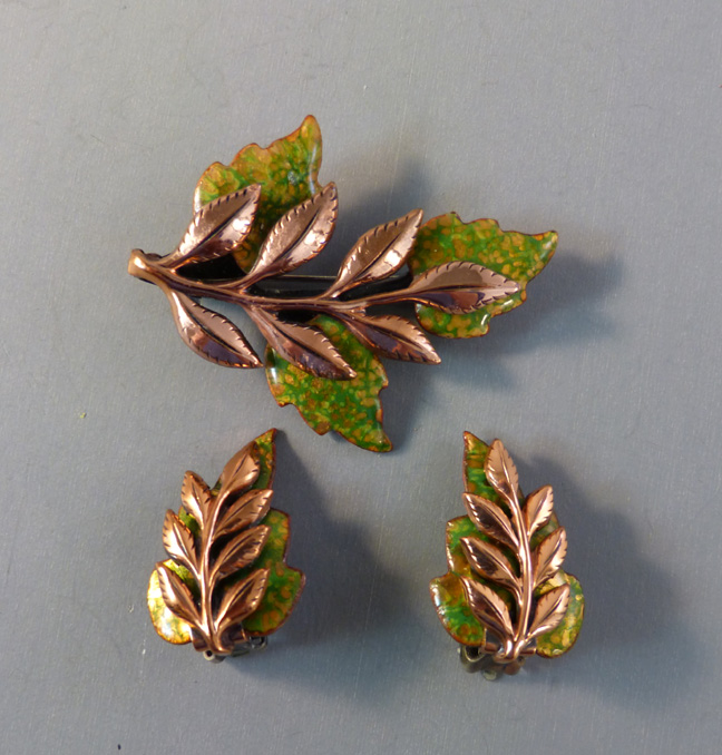MATISSE Renoir “Laurel” copper and green enamel leaves brooch and earrings, brooch 2-1/4″ and earrings 1-1/4″ clip backs. This style can be seen in Matthew Burkholz’s book, “Copper Art Jewelry” page 86 and was made in different colors for different seasons. View #N39424 $30.00
