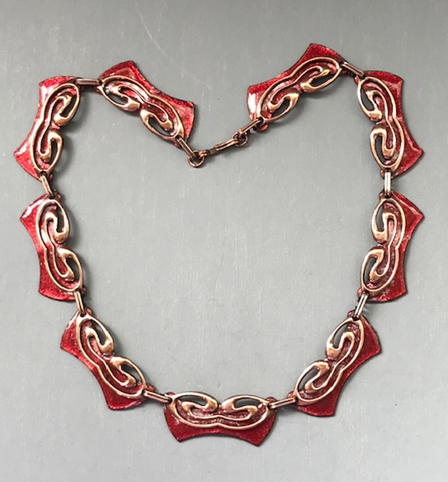 MATISSE copper necklace with red enameling, 14-1/2″ by 1/3″ wide, signed “Matisse” on the back. Made in the 1950s. View View View #N41747 $88.00