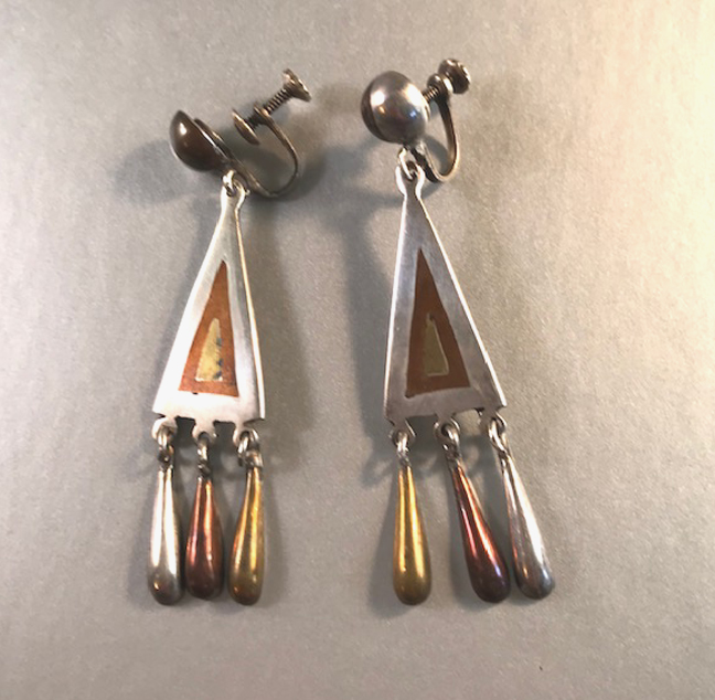 MEXICO pendant earrings in sterling silver, copper and gold mixed metals, one earring marked on the back “Hencho Made in Mexico, Taxco, 925″ and more difficult to read marks. They are screw back earrings that are 2-1/2″ long from the very top to the bottom and 5/8” at the widest. Even the ball tops are … Continue reading “MEXICO pendant earrings in sterling silver, copper and gold mixed metals”