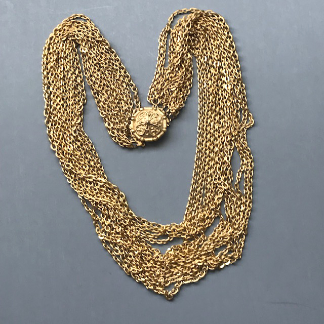 COROCRAFT gold tone metal chains long necklace with a lovely catch, signed “Corocraft” on the back, 16″ to 23″ long and in mint never worn condition. This came from a shop that closed in the 1960s and it was never worn. View View #C41745 $42.00