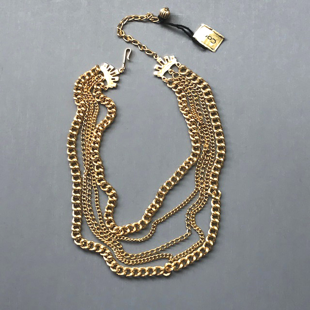 CORO gold tone metal chains necklace with the original 1960s tag, signed only on the foil tag, can be worn from 15″ to 18″ long, mint never worn condition. This came from a shop that closed in the 1960s and it was never worn. View #C41743 $42.00