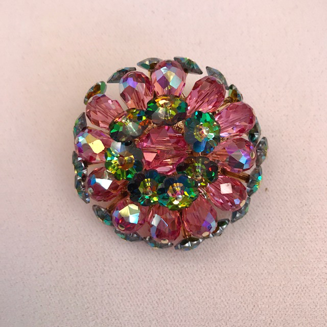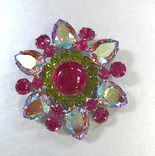 VENDOME beautiful rose and aurora borealis starburst of color brooch, 2-1/2″. The rhinestones used in most of the jewelry by this maker are high quality, and the come in amazing colors, just like in this brooch. The rose colored cabochon center and the green and aurora borealis are in a rhodium plated setting and they’re in excellent condition, … Continue reading “VENDOME beautiful rose and aurora borealis starburst of color brooch”