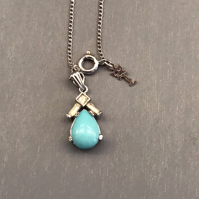 TRIFARI silver pendant with a teardrop-shaped glass aqua and clear rhinestones, 15″. We got a small group of pendants like this made by Trifari and also by Coro, and they are all in great vintage condition, circa 1960. #T40050 $24.00