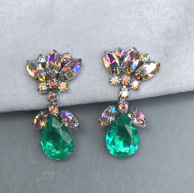 VENDOME pendant earrings with brilliant aqua drops and aurora borealis tops all set in silver tone rhodium. Signed on the back “Vendome”, they are clip backs 1-1/2″ long. Circa 1960, these are in excellent vintage condition. View #C40236 $32.00