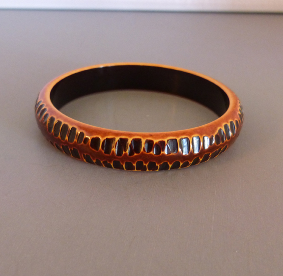 BAKELITE brown carved, textured and black washed bangle, 2-1/2″ by 1/2″ by 1/4″. This is n excellent condition and circa 1940. Bangles like these are terrific in stacks or as spacers. I once had a stack of these bangles that came to me with “Coro” tags on them, but this one has no tags at … Continue reading “BAKELITE brown carved, textured and black washed bangle”