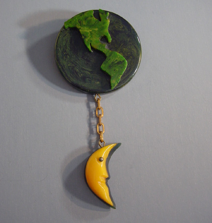 ADRIAN bakelite earth and crescent moon dangle brooch in dark green and butterscotch, round disk 2″ and moon 1-1/3″. Adrian made very few pieces, I am told less than 20, and what he did make shows amazing craftsmanship. This piece is shown in the “Bakelite Pins” book by Karima Parry on page 185. There is … Continue reading “ADRIAN bakelite earth and crescent moon dangle brooch”