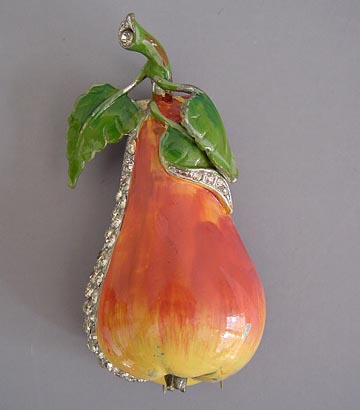 McCLELLAND BARCLAY Arts & Crafts sterling pear fruit set of necklace, bracelet and earrings, 15-1/2″ by 3/4″ necklace, 6-3/4″ by 3/4″ bracelet and 7/8″ earrings. McClelland Barclay was both an illustrator and a designer. Born in 1891, he painted and made sculptural utilitarian pieces and decorative objects for the home, as well as wonderful jewelry. His design … Continue reading “McCLELLAND BARCLAY sterling pear set”