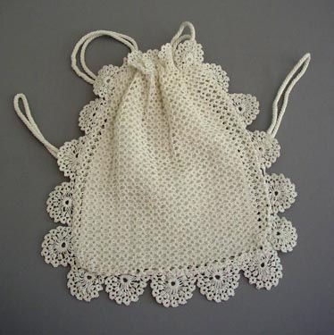 TATTED antique purse with a drawstring top, 8″ by 8″. Tatting like this took hours of work, like so many of the vintage hand crafts, and this was probably done circa 1900. It would be a lovely bag to carry with a reenactment outfit, too. View #P23865 $125.00