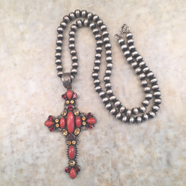 FEENEY Leo Feeney sterling cross of coral, faceted garnets and citrine, 3-1/4″ by 2″ with a 5/8″ loop and a 23″ sterling beads pendant necklace. The beads are hand made and the cross has such beautiful colors. This is from a well known master craftsman and jewelry maker. View #N39768 $698.00