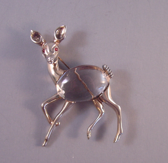 JELLY BELLY deer figural brooch with a Lucite belly set in sterling, marked “sterling” on the back, circa 1940s. This charming creature is 2-1/2″ tall and 1-5/8″ wide. A brooch like this one can be seen in Brunialti’s book, “American Costume Jewelry, Art & Industry, M-Z” on page 224. This piece can be seen … Continue reading “JELLY BELLY deer brooch with a Lucite belly set in sterling”