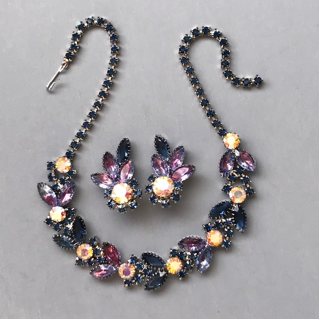 CHAINS style brooch/pendant combination and matching earrings with purple, gray and pink rhinestones in a very detailed setting of yellow gold plate. The brooch has a emerald cut center rhinestone surrounded by lavender, pink and gray marquis, and it is shot through with a golden arrow and covered with a filigree swirl, and it is … Continue reading “CHAINS style brooch/pendant combination and matching earrings with purple, gray and pink rhinestones”