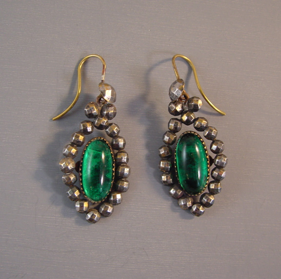 GEORGIAN or early VICTORIAN antique cut steel and green foiled glass cabochons drop earrings, very old and still glowing with color, entire length 1-3/4″. Tinted and foiled quartz pieces of jewelry similar to these can be seen in the wonderful book “Georgian Jewellery” by Ginny Reddington & Tom Dawes on page 102, where they date … Continue reading “GEORGIAN or early VICTORIAN cut steel and green foiled glass cabochons drop earrings, very old”