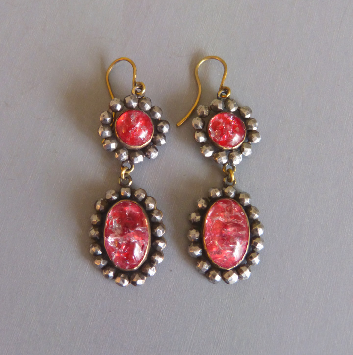 GEORGIAN or early Victorian antique cut steel drop pierced earrings with foil backed red tinted glass cabochon centers. The centers look like they are rose tinted and foiled underneath, typical for this era, and the sparkles you see are decorative, not damage. In other words, the top of the cabochons are perfectly smooth with no … Continue reading “GEORGIAN or early Victorian antique cut steel drop pierced earrings with foil backed red tinted glass cabochon centers”