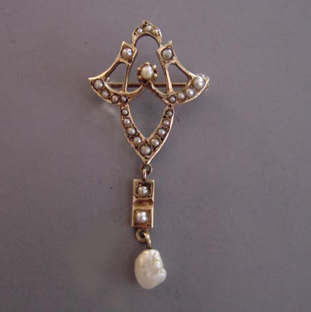 EDWARDIAN 14 karat yellow gold and seed pearls brooch circa 1900. This 1-5/8″ pin could also be used with on a chain and make it a pendant if desired. This is a fine antique piece of jewelry and it is in excellent condition. View #Q32946 $235.00