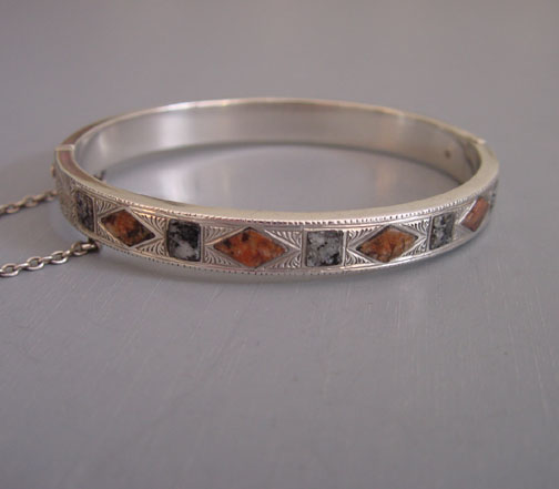 EDWARDIAN sterling silver and agate hinged bangle bracelet, maker “JC&S” and hallmarked for Birmingham 1918. Each piece of agate has an etched design all around it, and while one very old and very stable crack is barely visible in a tiny segment, it does not detract. There is a safety chain attached and the bracelet … Continue reading “Edwardian English JC&S sterling and agate bangle 1918”