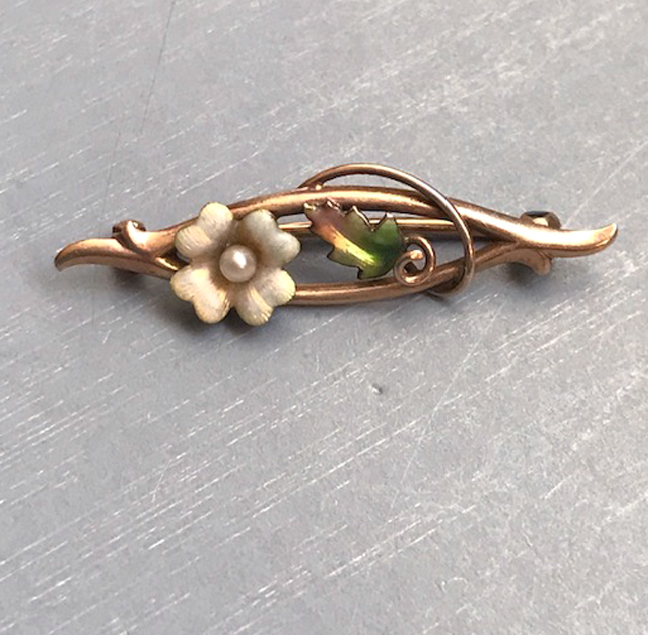 EDWARDIAN Art Nouveau 10 karat yellow gold pin with a delicately enameled flower and leaf and a pearl center, a dainty piece as suited the fashions of the day, about 1910. It is 1-1/4″ and just lovely. This is an antique jewelry piece and it is in excellent condition with such lovely colors. The translucent … Continue reading “EDWARDIAN Art Nouveau antique 10 karat yellow gold pin with a delicately enameled flower”